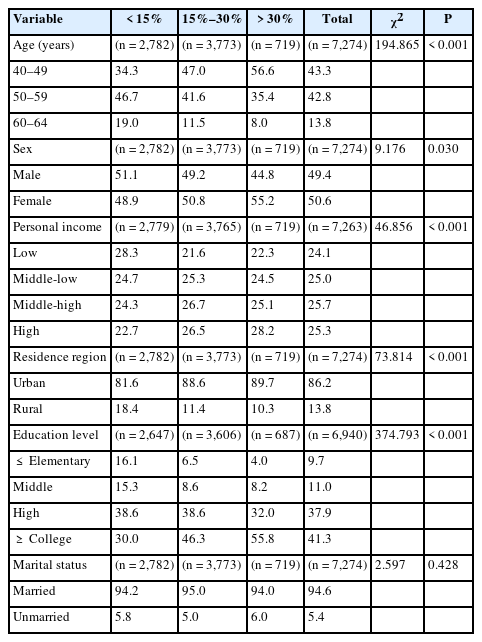 제7기(2016–2018) 국민건강영양조사 원시자료를 활용하였다. 연구 대상자는 중년 성인(만 40–64세) 중 일반 및 건강행태조사, 건강검진조사, 영양조사에 모두 참여한 자로서, 지방 섭취 결측자, 하루 에너지 500 kcal 미만 섭취자, 5,000 kcal 이상 섭취자, 임신부, 수유부를 제외한 총 7,274명이었다. 2020 한국인 영양소 섭취 기준[7]에서 제시한 성인 지방 에너지적정비율 15%–30% 기준에 따라, 부족군(< 15% 섭취), 적정군(15%–30% 섭취), 과잉군(> 30% 섭취)으로 분류하였다[17]. 부족군 2,782명(38.2%), 적정군 3,773명(51.9%), 과잉군 719명(9.9%)이었다. 지방 에너지 섭취비율은 개인별 24시간 회상조사에 의해 도출된 지방 섭취량에 9 kcal을 곱한 후, 총 에너지 섭취량으로 나누어 계산하였다.