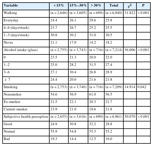 걷기, 음주, 흡연, 주관적 건강인식을 살펴보았다. 걷기는 전혀 하지 않음, 주 1–3일, 주 4–6일, 매일로 분류하였다. 음주는 1회 음주량에 따라 0잔, 1–2잔, 3–6잔, 7잔 이상으로 분류하였다. 흡연은 현재흡연자, 과거흡연자, 비흡연자로 분류하였다. 주관적 건강인식은 좋음(매우 좋음 포함), 보통, 나쁨(매우 나쁨 포함)으로 분류하였다[19-21].