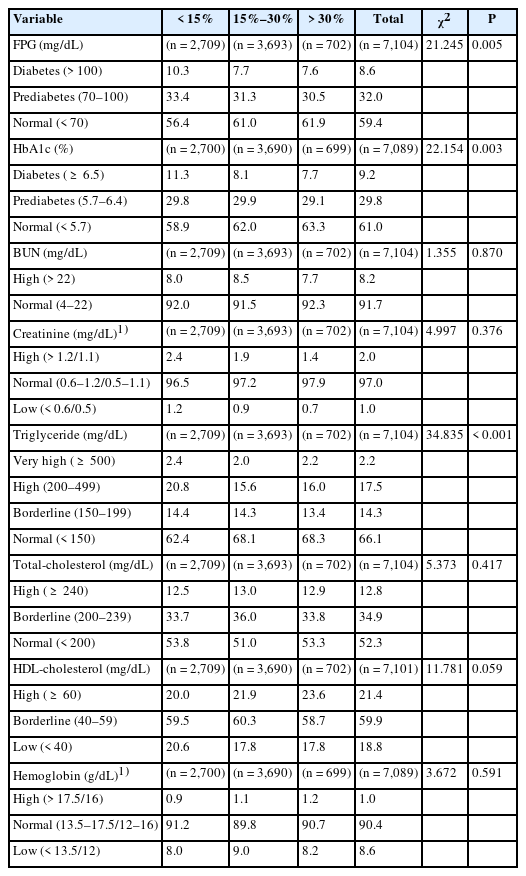 공복혈당, 당화혈색소, 혈중 요소질소, 혈중 크레아티닌, 중성지방, 총 콜레스테롤, HDL-콜레스테롤, 헤모글로빈을 살펴보았으며, 판정 기준에 따라 구간별 백분율로 나타냈다[18, 22-25].