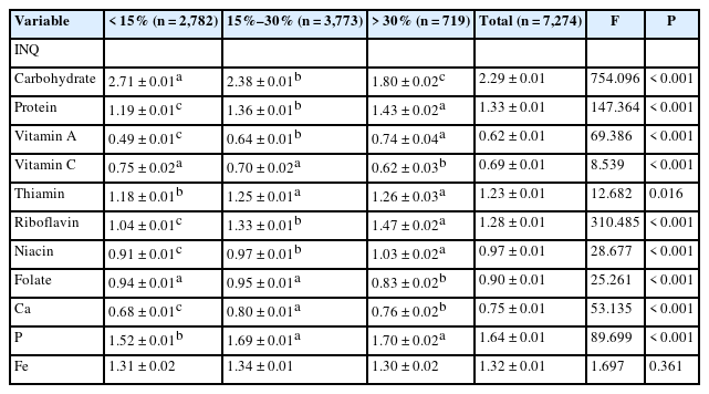 조사대상자의 영양소의 질적 섭취는 Table 5와 같다. 전체 조사대상자 INQ를 살펴보면, 탄수화물, 단백질, 티아민, 리보플라빈, 인, 철은 모든 군에서 1.0 이상이었다. 비타민 A, 비타민 C, 칼슘은 0.75 이하였다. 세 군 간 차이를 살펴보면, 단백질, 비타민 A, 티아민, 리보플라빈, 니아신, 칼슘, 인의 INQ가 세 군 중 부족군에서 가장 낮았다. 반면, 탄수화물, 비타민 C, 엽산의 INQ가 세 군 중 과잉군에서 가장 낮았다.