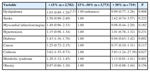 간경변증은 부족군 3.62배, 과잉군 5.83배로 높아, 지방 에너지 섭취비율의 적정 수준을 벗어나는 것은 간경변증의 위험을 크게 높일 수 있음을 보여주었다. 지금까지 지방 섭취에 따른 간경변증의 위험을 살펴본 연구는 미미하였지만, Rosqvist 등[13]과 Luukkonen 등[39]의 연구에서, 포화지방산의 과도한 섭취는 간의 지방 축적을 유의미하게 증가시키는 것으로 보고하였다. 지방이 간에 5%를 초과하여 축적된 상태인 지방간은 정도가 심해지면 간경변증으로 진행할 수 있어[25] 간경변증 예방을 위해, 지방 에너지 15%–30%로 섭취하는 것이 매우 중요하다고 생각된다. 대사증후군은 적정군과 비교하여, 부족군 1.28배, 과잉군 1.13배로 증가하였다. Her [17]와 Lee & Kwon [40]의 연구에서, 지방 에너지 섭취비율 15% 이상 25% 미만인 군에 비해, 15% 미만 군과 25% 이상 군에서, 대사증후군 위험도가 다소 높았으나, 통계적으로 유의미하지는 않았다. 그러나 낮은 HDL-콜레스테롤, 높은 수축기혈압과 같은 대사증후군의 위험요인에는 유의적으로 영향을 미치는 것으로 보고되어[40], 대사증후군 위험 감소를 위해 지방 에너지 15%-30%를 섭취하는 것이 중요할 것으로 생각된다. 비만은 본 연구에서 각 군간 유의미한 차이를 보이지는 않았으나, Wang 등[41]의 연구에서, 지방 에너지 섭취비율을 30% 초과하여 섭취하는 것은 과체중 및 비만의 위험을 13.2% 증가시키는 것으로 보고되어, 비만을 예방하기 위해 지방 에너지 섭취가 30%를 초과하지 않도록 하는 것이 중요하다고 생각된다.