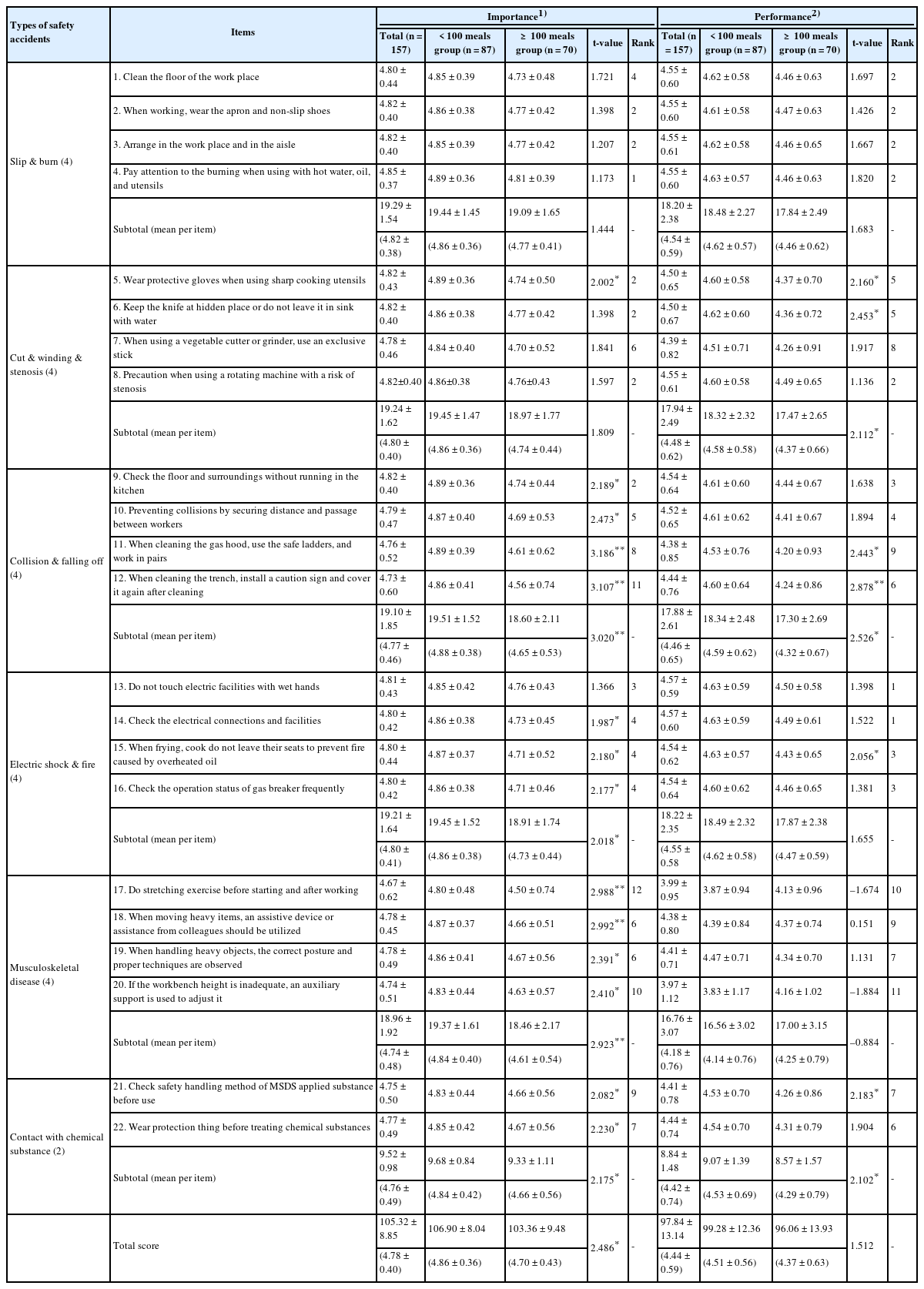 Although the perceived importance of accident prevention was high (mean = 4.78), the actual performance was lower (mean = 4.44), reflecting a documented gap between risk perception and behavioral implementation [21-23]. Among the types of safety accidents, “Slip & burn” were perceived as the most important, whereas “Musculoskeletal disease” received the lowest scores in both perceived importance and performance. These findings appear to be related to the most frequently reported types of safety accidents in previous studies, with “burns” (46.4%) being the most common among industrial food service workers [6] and “slips” (66.2%) among school food service employees [7]. It also highlights issues related to risk factors, suggesting that in work environments where repetitive physical tasks are routine, associated hazards may be easily overlooked [24]. Although stretching and the use of assistive devices are critical behaviors for preventing safety accidents, their actual implementation rates were relatively low. Therefore, linking awareness to performance through targeted education on these behaviors may contribute meaningfully to strengthening practical safety outcomes. Comparisons based on the daily number of meals served presented that both overall importance and performance scores were higher in the < 100 meals group compared to the ≥ 100 meals group. Among the 22 items, statistically significant differences were observed between groups in 14 items for importance and 6 items for performance (P < 0.05 P < 0.01). This difference can be interpreted as reflecting clearer recognition of personnel’ roles and responsibilities in smaller-scale units, leading to relatively higher risk awareness. This finding is consistent with previous reports indicating that safety culture and risk perception may vary according to organizational size [25].