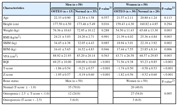 | Bone status | Men (n = 50) | Women (n = 50) | P-value |