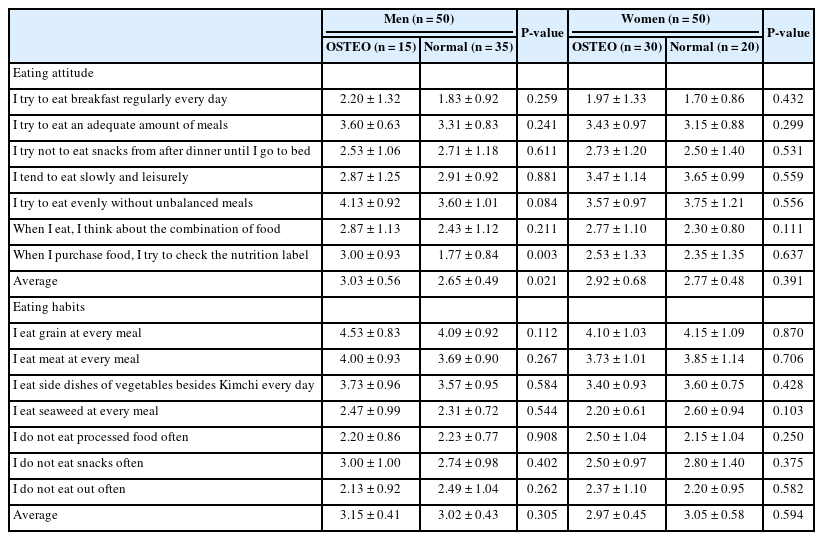 | I eat side dishes of vegetables besides Kimchi every day | 3.73 ± 0.96 | 3.57 ± 0.95 | 0.584 | 3.40 ± 0.93 | 3.60 ± 0.75 | 0.428 |