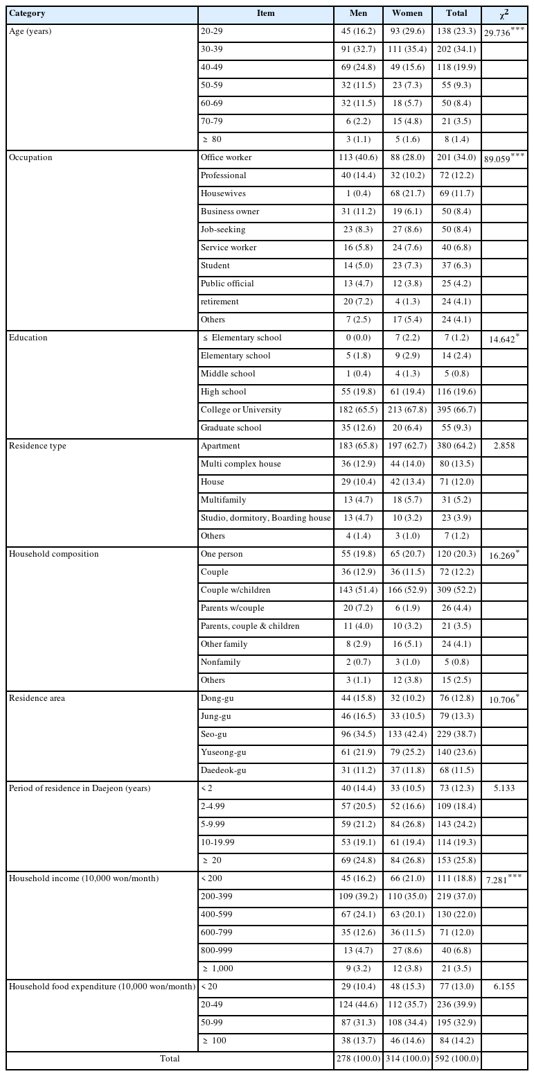 | Household food expenditure (10,000 won/month) | < 20 | 29 (10.4) | 48 (15.3) | 77 (13.0) | 6.155 |