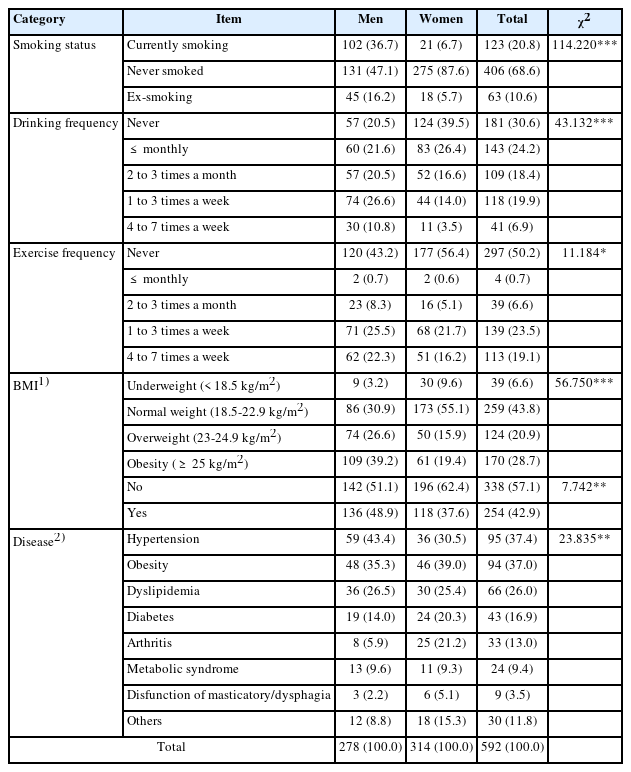 | Disease2) | Hypertension | 59 (43.4) | 36 (30.5) | 95 (37.4) | 23.835** |