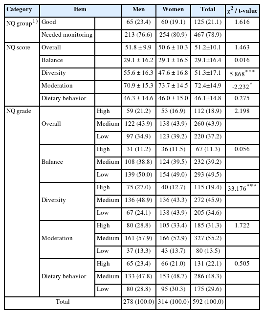 | Category | Item | Men | Women | Total | χ2 |