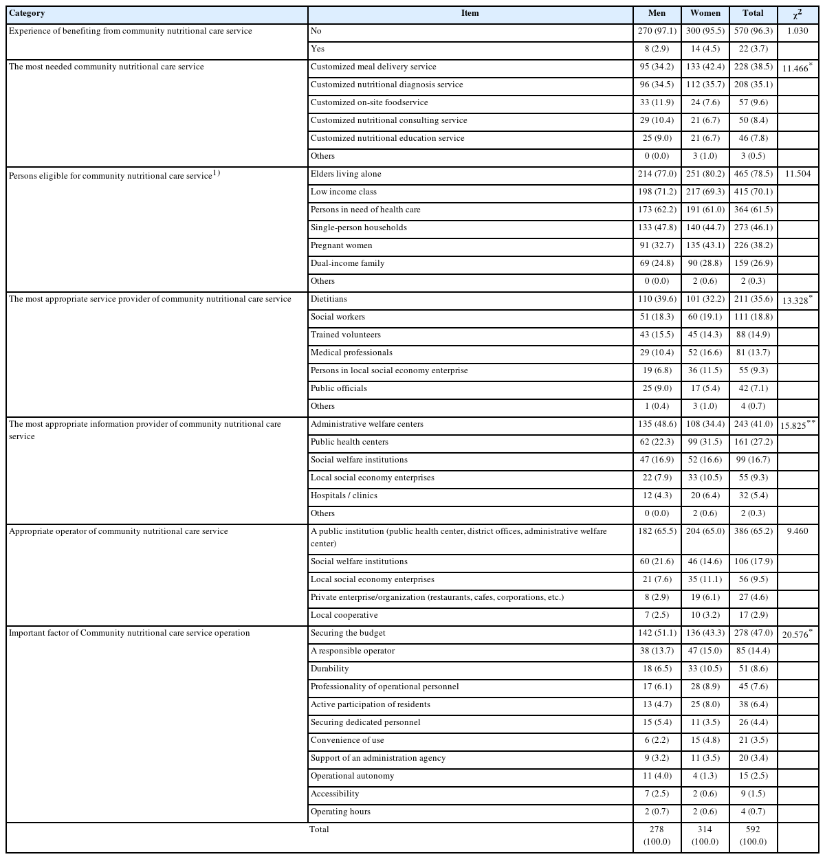 | Important factor of Community nutritional care service operation | Securing the budget | 142 (51.1) | 136 (43.3) | 278 (47.0) | 20.576* |