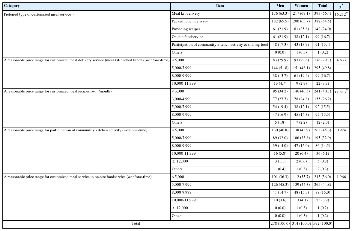 | Preferred type of customized meal service1) | Meal kit delivery | 176 (63.3) | 217 (69.1) | 393 (66.4) | 16.212* |