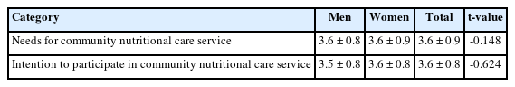 | Intention to participate in community nutritional care service | 3.5 ± 0.8 | 3.6 ± 0.8 | 3.6 ± 0.8 | -0.624 |