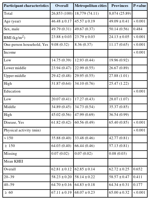n (weighted %), weighted % (SE), or mean ± SE. KNHANES, Korea National Health and Nutrition Examination Survey; BMI, body mass index; KHEI, Korean Healthy Eating Index; SE, standard error. Education level was categorized into high: ≥ college, middle: high school, and low: < high school for adults < 60 years of age and high: ≥ high school, middle: middle school, and low: < middle school for adults ≥ 60 years of age. Metropolitan cities include Seoul, Busan, Daegu, Daejeon, Gwangju, Ulsan, Incheon, and Gyeonggi-do. Provinces include Gangwon-do, Chungcheongbuk-do, Chungcheongnam-do, Gyeongsangbuk-do, Gyeongsangnam-do, Jeollabuk-do, Jeollanam-do, and Jeju-do. Disease includes dyslipidemia, myocardial infarction, angina renal disease, hypertension, and diabetes. Comparisons between metropolitan cities and provinces were performed using the t-test or chi-square test.