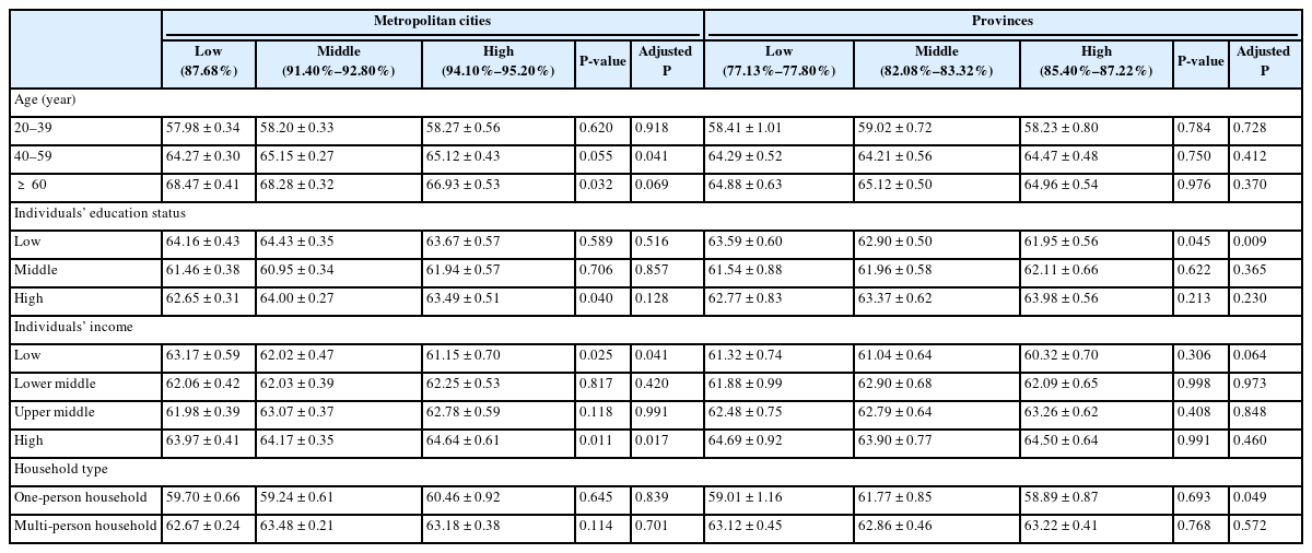 Weights were applied to account for the complex survey design. ANOVA was conducted to compare mean KHEI scores. Adjusted P-values were adjusted for participant age, sex, disease, physical activity, body mass index, education, and income. Age was not adjusted for in analyses by age group. Metropolitan cities were classified as low (Gyeonggi-do), middle (Seoul, Incheon, and Busan), and high (Daejeon, Gwangju, Daegu, and Ulsan). Provinces were categorized into low (Gangwon-do and Jeollanam-do), middle (Jeollabuk-do, Chungcheongnam-do, and Chungcheongbuk-do), and high (Jeju-do, Gyeongsangbuk-do, and Gyeongsangnam-do).