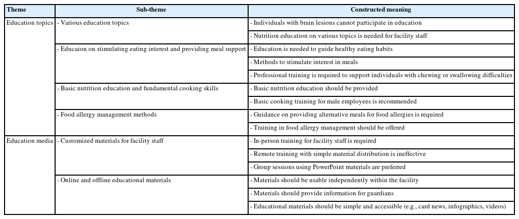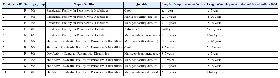 | 10 | M | 50s | Short-term residential facility for persons with disabilities | Manager (facility director) | ≥ 10 years | ≥ 20 years |