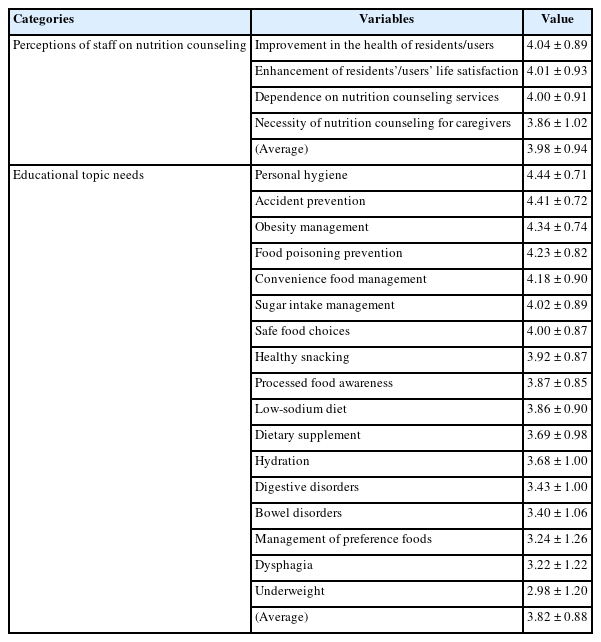 | Necessity of nutrition counseling for caregivers | 3.86 ± 1.02 | |