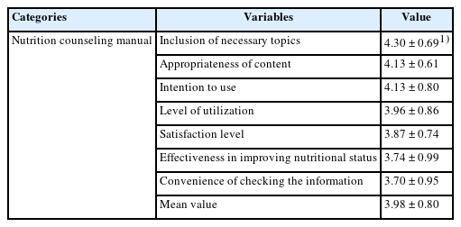 | Nutrition counseling manual | Inclusion of necessary topics | 4.30 ± 0.691) |