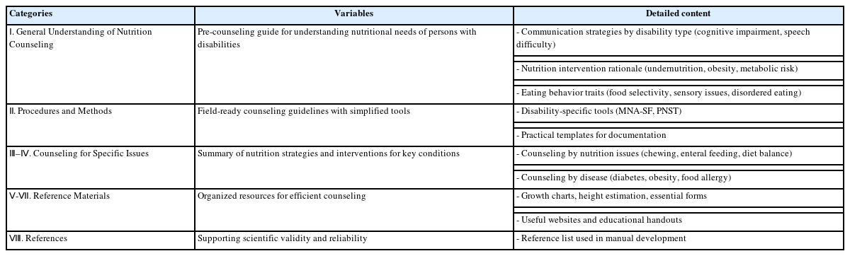 | Ⅰ. General understanding of nutrition counseling | Pre-counseling guide for understanding nutritional needs of persons with disabilities | - Communication strategies by disability type (cognitive impairment, speech difficulty) |