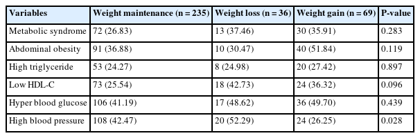 | Variables | Weight maintenance (n = 235) | Weight loss (n = 36) | Weight gain (n = 69) | P-value |