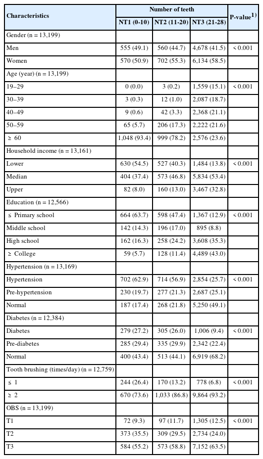 Results of multiple multinomial logistic regression models. ORs indicate the likelihood of belonging to the NT1 or NT2 number of teeth categories. Model 1 unadjusted model. Model 2 adjusted for socioeconomic variables (gender, age, household income and education). Model 3 adjusted for the same factors as Model 2 plus general health variables (hypertension, diabetes mellitus and toothbrushing). OBS, oxidative balance score; Ref, reference; OR, odds ratio; CI, confidence interval.