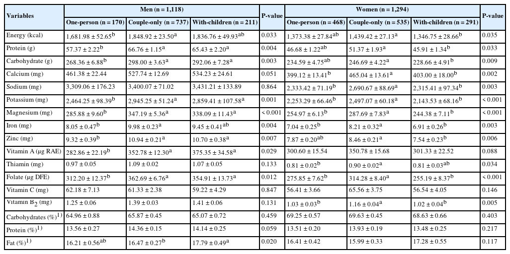 Mean ± SE. Statistical analysis: Values were obtained using a general linear model for continuous variables in complex sample survey data analysis ( Carbohydrate (%), protein (%), and fat (%) indicate the percentage contribution of each macronutrient to total daily energy intake, adjusted for total energy intake. Values are significantly different according to the Bonferroni post hoc test (