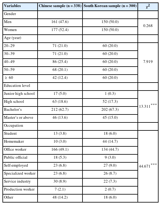 | Variables | Chinese sample (n = 338) | South Korean sample (n = 300) | χ2 |