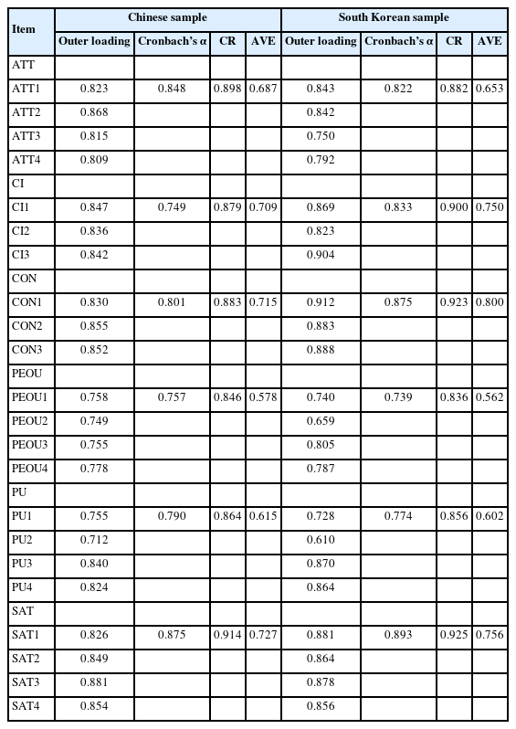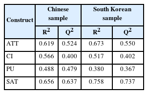 CN, Chinese sample; KR, South Korean sample; ATT, attitude; CI, continuance intention; CON, confirmation; PEOU, perceived ease of use; PU, perceived usefulness; SAT, satisfaction.