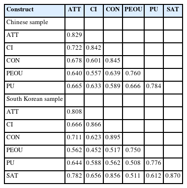 The diagonal is the square root of AVE. ATT, attitude; CI, continuance intention; CON, confirmation; PEOU, perceived ease of use; PU, perceived usefulness; SAT, satisfaction.