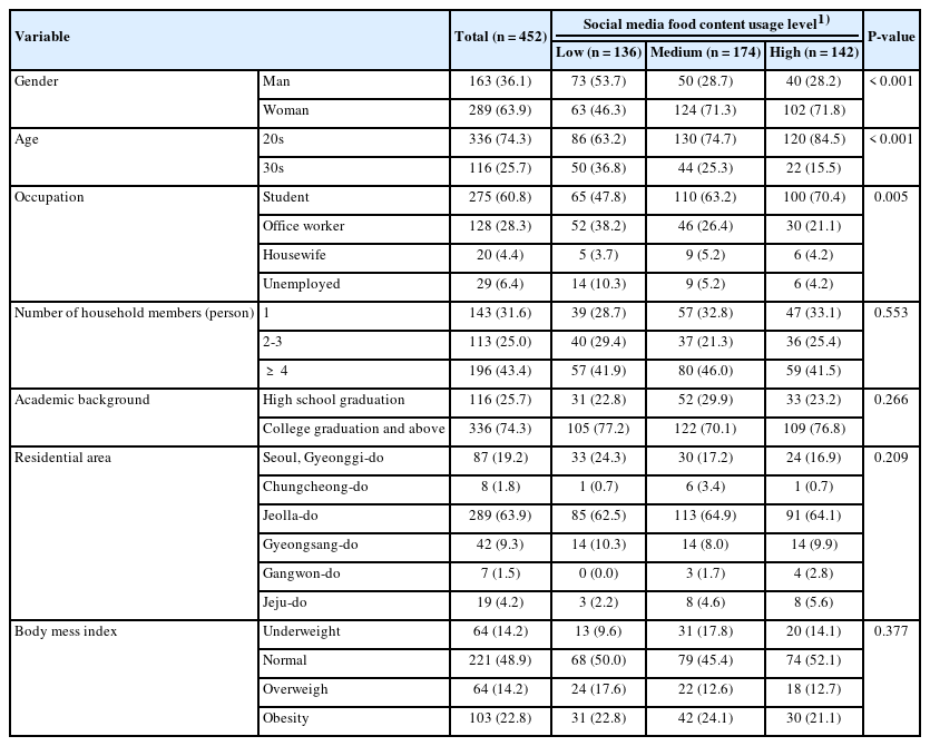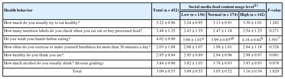 | Health behavior | Total (n = 452) | Social media food content usage level |