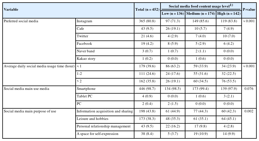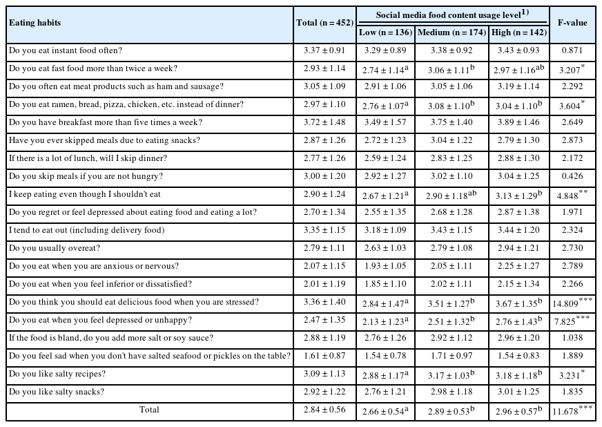 | Eating habits | Total (n = 452) | Social media food content usage level |