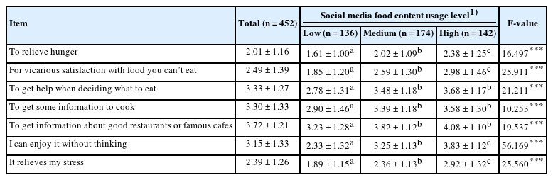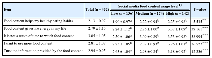 Mean ± SD Means with different lowercase letters in the same row are significantly different by scheffe-test at Scores represent adherence as follows, 5: it really is, 4: yes, 3: average, 2: no, 1: not at all. Low: average score <2 points, both for frequency and viewing time of SNS food content; Medium: average score between 2-3 points for frequency and viewing time; High: average score ≥3 points for frequency and viewing time of SNS food content.