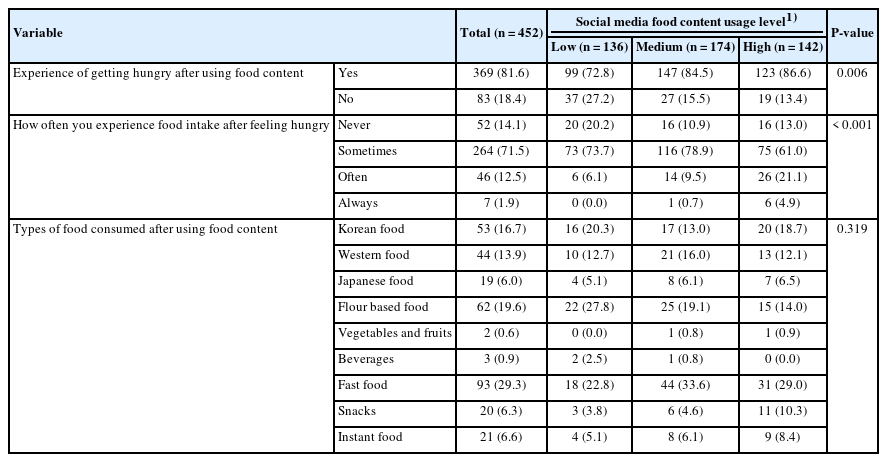 | Types of food consumed after using food content | Korean food | 53 (16.7) | 16 (20.3) | 17 (13.0) | 20 (18.7) | 0.319 |