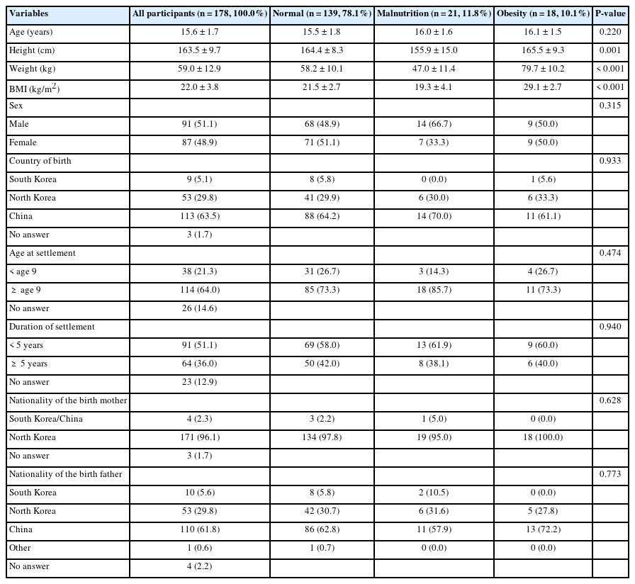 | Variables | All participants (n = 178, 100%) | Normal (n = 156, 87.6%) | Malnutrition (n = 10, 5.6%) | Obesity (n = 12, 6.7%) | P-value |