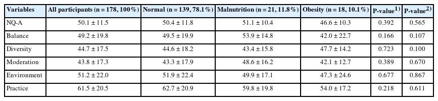 | Variables | All participants (n = 178, 100%) | Normal (n = 145, 81.5%) | Malnutrition (n = 6, 3.4%) | Obesity (n = 27, 15.2%) | P-value1) | P-value2) |