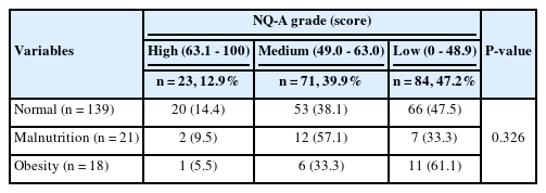 n (%). Nutritional status was defined as follows: for malnutrition; height for age z-score or weight for age z-score or weight for height z-score < -2SD, for obesity; BMI for age z-score ≥ +2SD. Grade criterion high grade: NQ-A score 63.1-100, medium grade: NQ-A score 49.0-63.0, low grade: NQ-A score 0-48.9. n: number of participants, NQ-A: Nutrition Quotient for Korean Adolescents