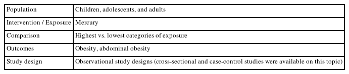 | Eom (2014) [14] | Korea | Cross-sectional | 2,114 | Adults from metropolitan and rural districts | 2010-2011 | M | 45.5 | Blood mercury (μg/L) | Abdominal obesity | WC ≥ 90 cm for men, ≥ 80 cm for women | 2.09 (1.60, 2.72) | Sex, age, smoking, alcohol drinking, household income, residence area, seafood intake |