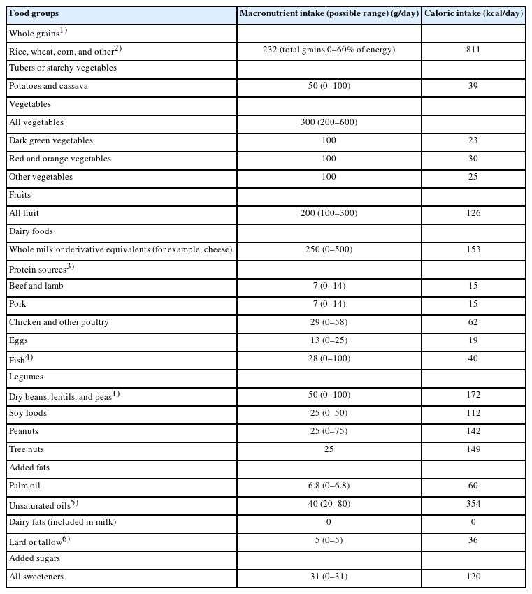| Food groups | Macronutrient intake (possible range) (g/day) | Caloric intake (kcal/day) |