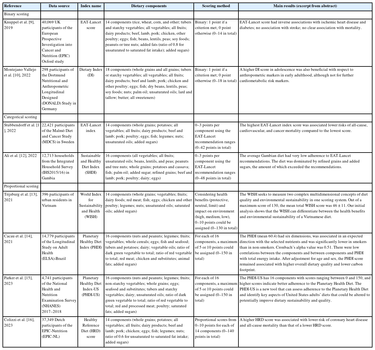 | Knuppel et al. [9], 2019 | 40,069 UK participants of the European Prospective Investigation into Cancer and Nutrition (EPIC) Oxford study | EAT-Lancet score | 14 components (rice, wheat, corn, and other; tubers and starchy vegetables; all vegetables; all fruits; dairy products; beef, lamb, pork; chicken, other poultry; eggs; fish; beans, lentils, peas; soy foods; peanuts or tree nuts; added fats (ratio of 0.8 for unsaturated to saturated fat intake); added sugars) | Binary: 1 point if a criterion met; 0 point otherwise (0–14 in total) | EAT-Lancet score had inverse associations with ischemic heart disease and diabetes; no association with stroke; no clear association with mortality. |