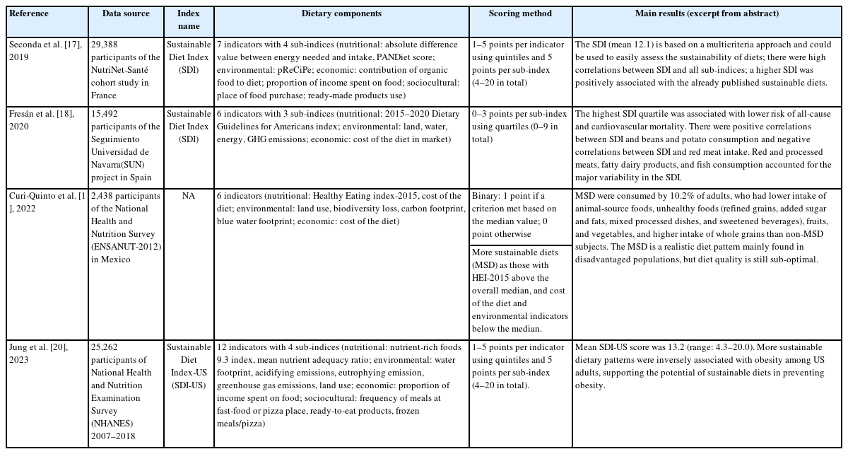 | Curi-Quinto et al. [19], 2022 | 2,438 participants of the National Health and Nutrition Survey (ENSANUT-2012) in Mexico | NA | 6 indicators (nutritional: Healthy Eating index-2015, cost of the diet; environmental: land use, biodiversity loss, carbon footprint, blue water footprint; economic: cost of the diet) | Binary: 1 point if a criterion met based on the median value; 0 point otherwise | MSD were consumed by 10.2% of adults, who had lower intake of animal-source foods, unhealthy foods (refined grains, added sugar and fats, mixed processed dishes, and sweetened beverages), fruits, and vegetables, and higher intake of whole grains than non-MSD subjects. The MSD is a realistic diet pattern mainly found in disadvantaged populations, but diet quality is still sub-optimal. |