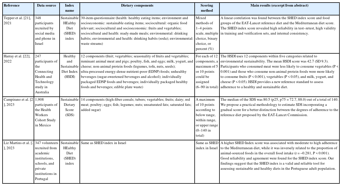 | Harray et al. [22], 2022 | 247 participants of the Connecting Health and Technology study in Australia | Healthy and Sustainable Diet Index (HSDI) | 12 components (fruit; vegetables; seasonality of fruits and vegetables; ruminant animal meat and pigs; poultry, fish, and eggs; milk, yogurt, and cheese; non-animal protein foods (legumes, tofu, nuts, seeds); ultra-processed energy-dense nutrient-poor (EDNP) foods; unhealthy beverages (sugar-sweetened beverages and alcohol); individually packaged EDNP foods and beverages; individually packaged healthy foods and beverages; edible plate waste) | For each of 12 components, a maximum of 5 or 10 points could be assigned (6–90 in total) | The HSDI uses 12 components within five categories related to environmental sustainability. The mean HSDI score was 42.7 (SD 9.3). Participants who consumed meat were less likely to consume vegetables (P < 0.001) and those who consume non-animal protein foods were more likely to consume fruits (P < 0.001), vegetables (P < 0.05), and milk, yogurt, and cheese (P < 0.05). HSDI provides a new reference standard to assess adherence to a healthy and sustainable diet. |