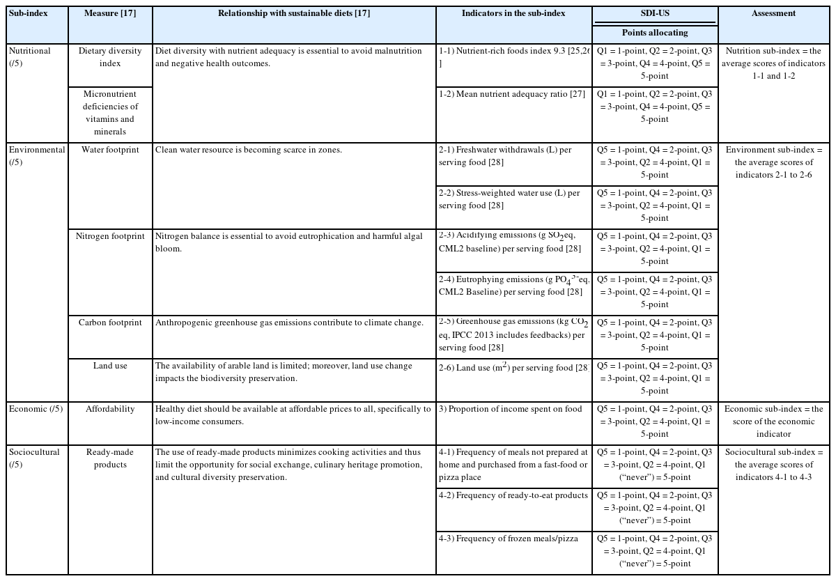 | Sociocultural (/5) | Ready-made products | The use of ready-made products minimizes cooking activities and thus limit the opportunity for social exchange, culinary heritage promotion, and cultural diversity preservation. | 4-1) Frequency of meals not prepared at home and purchased from a fast-food or pizza place | Q5 = 1-point, Q4 = 2-point, Q3 = 3-point, Q2 = 4-point, Q1 (“never”) = 5-point | Sociocultural sub-index = the average scores of indicators 4-1 to 4-3 |