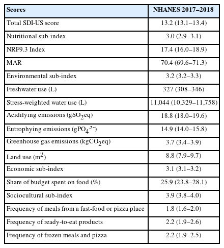 Mean score (range). SDI-US, Sustainable Diet Index-US; NHANES, National Health and Nutrition Examination Survey; NRF9.3 Index, Nutrient-Rich Foods 9.3 Index; MAR, mean nutrient adequacy ratio.