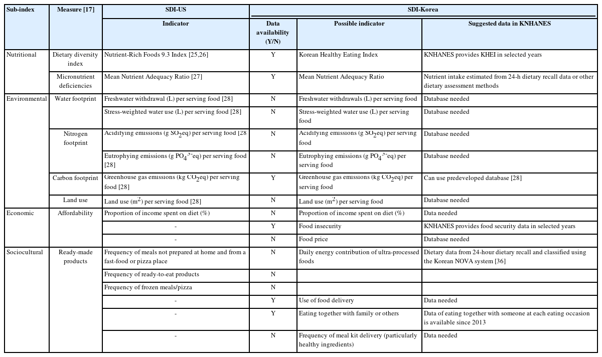 | Nutritional | Dietary diversity index | Nutrient-Rich Foods 9.3 Index [25,26] | Y | Korean Healthy Eating Index | KNHANES provides KHEI in selected years |