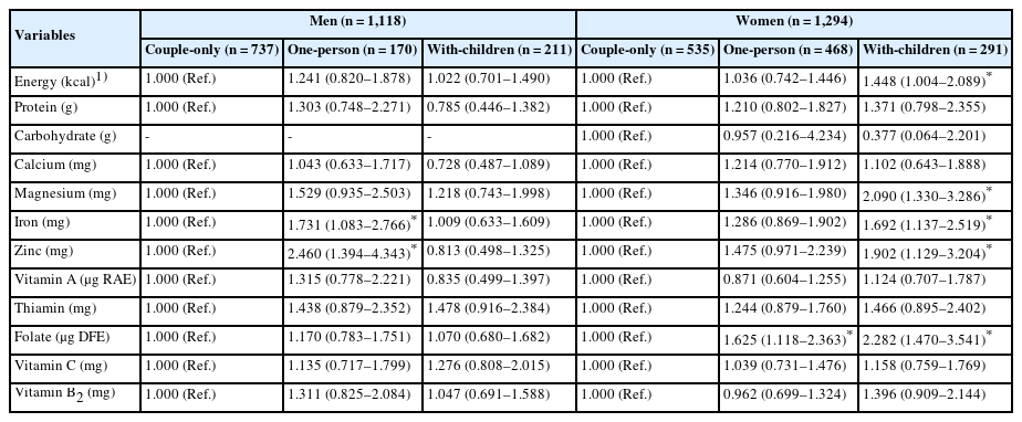 Elderly men in one-person households, compared with those in couple-only households, were more likely to skip breakfast and lunch and to consume less energy. The odds of intake below the estimated average requirement (EAR) were higher for iron (odds ratio [OR] = 1.731, P = 0.022) and zinc (OR = 2.460, P = 0.002) among men in one-person households. The KHEI score was the lowest among men in one-person households. Elderly women in with-children households, compared with those in couple-only households, were more likely to skip breakfast and to consume less energy. The risks of intake below the estimated energy requirement (EER) and EAR were higher among women in with-children households than those in couple-only households (EER: OR = 1.448; magnesium: OR = 2.090; iron: OR = 1.692; zinc: OR = 1.902; folate: OR = 2.282; all P < 0.05). The KHEI score was lower among women in with-children households.