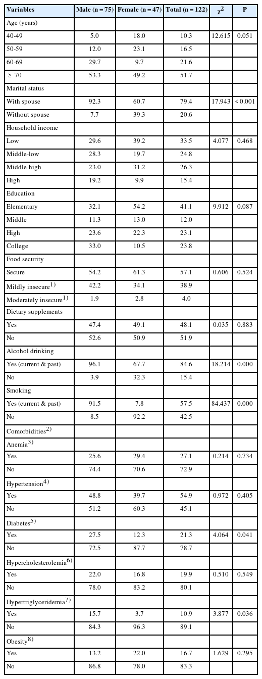 | Variables | Male (n = 75) | Female (n = 47) | Total (n = 122) | χ2 | P |