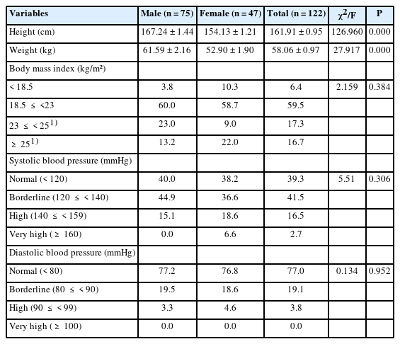 | Variables | Male (n = 75) | Female (n = 47) | Total (n = 122) | χ2/F | P |