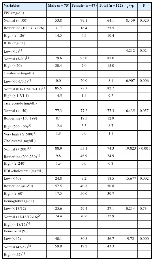%. All the estimates were obtained by complex sample analysis, using integrated sample weight, to represent the Korean population. Cells, expected frequency less than 5, were combined for χ2-test. FPG: fasting plasma glucose, BUN: blood urea nitrogen, HDL-cholesterol: high density lipoprotein-cholesterol