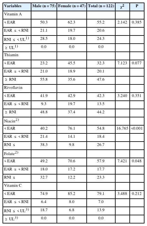 %. All the estimates were obtained by complex sample analysis, using integrated sample weight, to represent the Korean population. Cells, expected frequency less than 5, were combined for χ2-test. EAR: estimated average requirement, RNI: recommended nutrient intake, UL: tolerable upper intake level