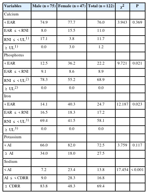%. All the estimates were obtained by complex sample analysis, using integrated sample weight, to represent the Korean population. Cells, expected frequency less than 5, were combined for χ2-test. EAR: estimated average requirement, RNI: recommended nutrient intake, UL: tolerable upper intake, CDRR: chronic disease risk reduction intake