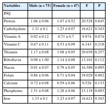 | Variables | Male (n = 75) | Female (n = 47) | F | P |