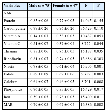 Mean ± S.E. All the estimates were obtained by complex sample analysis, using integrated sample weight, to represent the Korean population. NAR: nutrient adequacy ratio, MAR: mean adequacy ratio