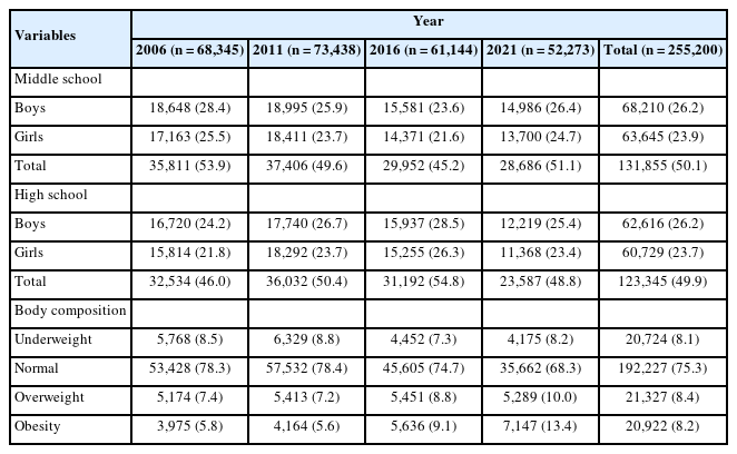 | Overweight | 5,174 (7.4) | 5,413 (7.2) | 5,451 (8.8) | 5,289 (10.0) | 21,327 (8.4) |